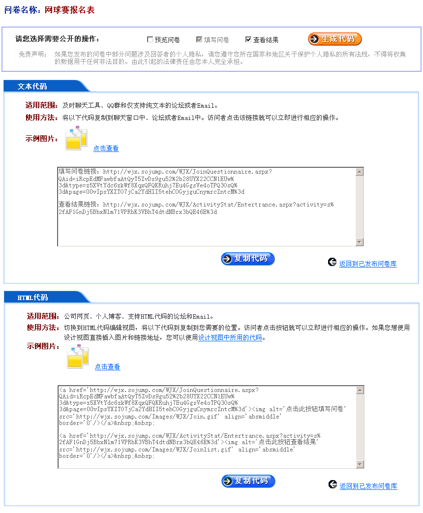 通过问卷星发布问卷后,您可以获取预览问卷、填写问卷、查看结果的入口代码,代码分为完整页面的链接地址简洁页面的iframe嵌入代码